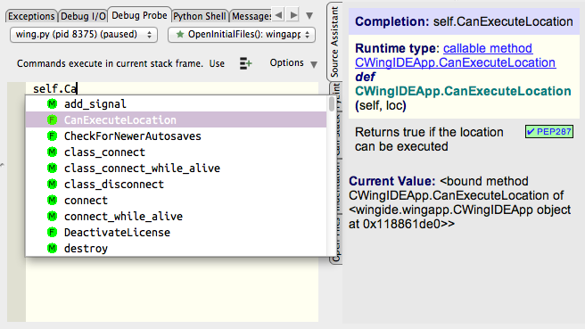 The Debug Probe provides auto-completion that is integrated with Wing's Source Assistant, where you can see call signature, documentation, and other information relevant to the code you are typing.