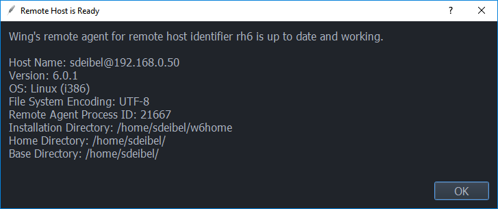 Press Install Remote Agent and Wing will install the agent and then retry establishing a connection to the agent. If this succeeds, you will see a dialog as follows: