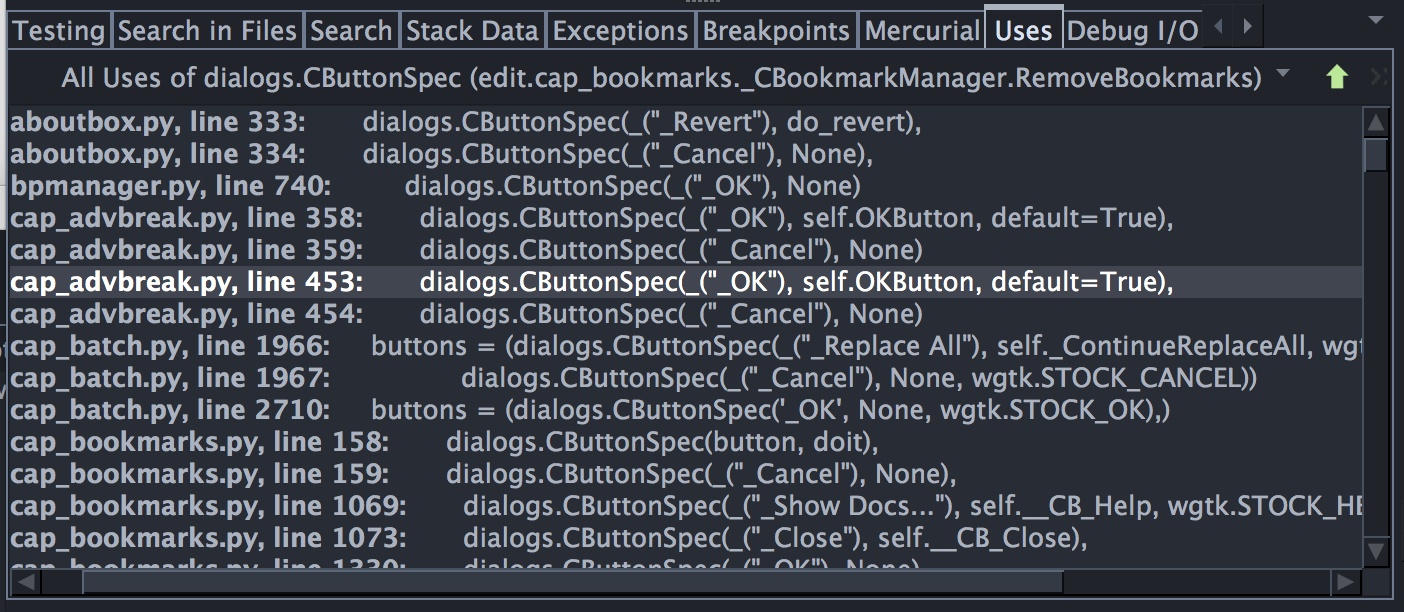 To find all occurrences of other strings in Python files or in project files of any type, use the Search in Files tool from the Tools menu with Look in set to Project Files and Filter set to the narrowest filter that includes the files that you wish to search: