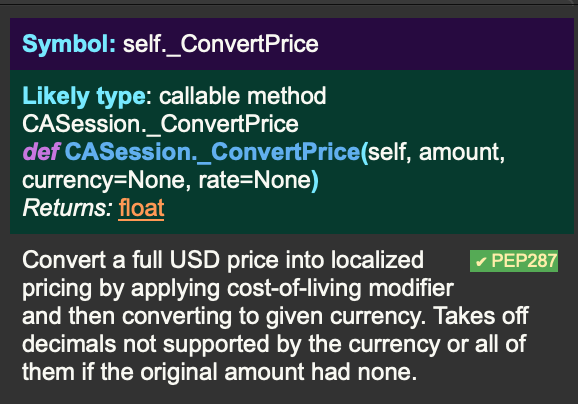 Wing's Source Assistant continuously updates to display type information, inline documentation, call tips, and links into Python documentation for the code that you write or visit in the editor, auto-completer, integrated Python Shell, Debug Console, and other tools. Wing understands PEP 484 and PEP 526 type annotations and it uses typeshed for standard library and covered third party module analysis.